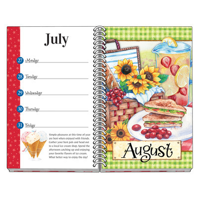 It's a pleasure to note your appointments in this handy daily planner exclusively designed by Gooseberry Patch! The convenient spiral binding makes it easy to display the calendar flat on your desk, or to tote along in your bag. With weekly views, as well as month-at-a-glance views, you'll stay organized while enjoying the helpful kitchen tips, yummy recipes and charming artwork sprinkled throughout. Durable softcover, 112 pages. (5-1/2" x 8-1/4")